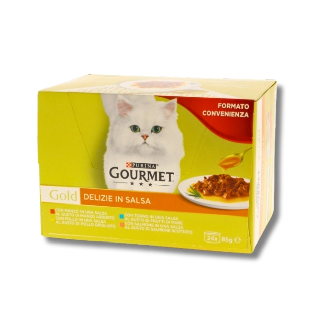 24x85gr Gold Multipack Delizie Salsa. alimento umido completo in lattina che soddisfa il palato sofisticato del tuo gatto adulto. Questo alimento senza l’aggiunta di coloranti, conservanti o aromi artificiali, contiene ingredienti di alta qualità così puoi essere sicuro di offrire al tuo GATTO un’alimentazione genuina e salutare, senza compromessi.