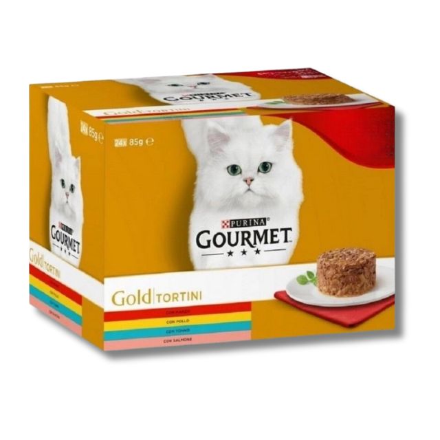24x85gr Gold Multipack Tortini. alimento umido completo in lattina che soddisfa il palato sofisticato del tuo gatto adulto. Questo alimento senza l’aggiunta di coloranti, conservanti o aromi artificiali, contiene ingredienti di alta qualità così puoi essere sicuro di offrire al tuo GATTO un’alimentazione genuina e salutare, senza compromessi.