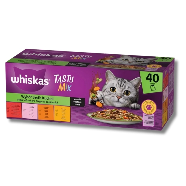 40×85 Gr Whiskas Tasty Mix. alimento completo e bilanciato, adatto ai gatti adulti. senza coloranti artificiali e conservanti aggiunti, queste bustine rappresentano un alimento bilanciato dal gusto sempre fresco. La composizione dei bocconcini sono formulate con veterinari: con livelli bilanciati di minerali per supportare un tratto urinario sano, con Zinco che aiuta a mantenere pelle e pelo sani.