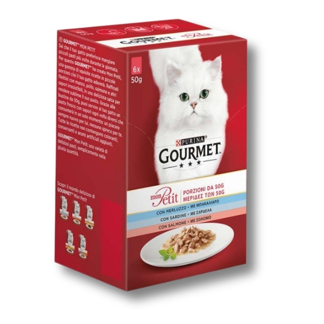 6x50gr Mon Petit Multipack Pesce Merluzzo Sardina Salmone.