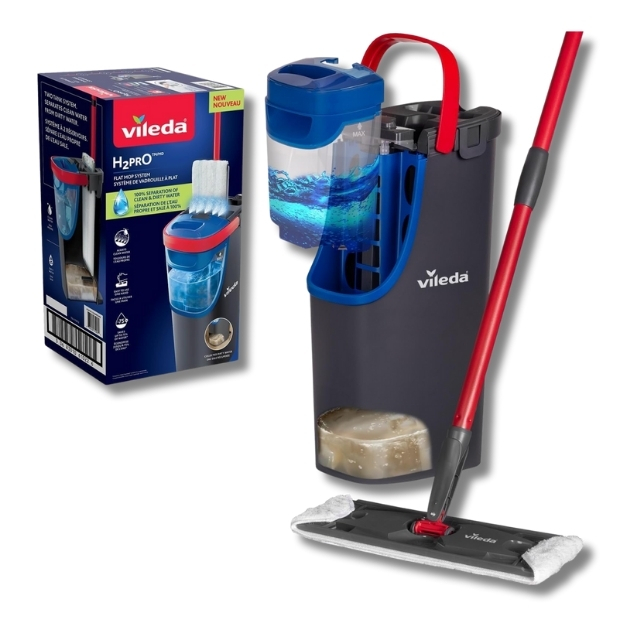 H2pro Flatmop Complete. Il sistema lavapavimenti a piastra piatta Vileda H2Pro Flat Mop è progettato per rivoluzionare la pulizia della casa con le sue funzionalità avanzate e il design compatto. Questo innovativo sistema include una tecnologia a doppio serbatoio che garantisce 100% di separazione dell’acqua pulita da quella sporca, favorendo un processo di pulizia più igienico. L’impugnatura ergonomica consente l’utilizzo con una sola mano e uno sforzo fisico minimo, mentre il design compatto lo rende ideale per essere riposto in spazi ristretti. La tecnologia del panno in microfibra non solo cattura efficacemente lo sporco ostinato, ma fornisce anche una finitura senza aloni su tutti i tipi di pavimento.
