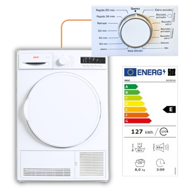 Asciugatrice Akai Kg 8 Classe A Asc8034v. Oblò 47cm, cestello 101lt, consumo energetico 235/127 kwh anno, dimensioni L596x P536x H845mm