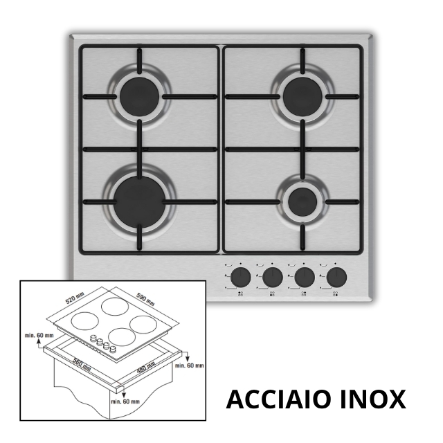 Piano Cottura Daya Dspc-4g60fb 4fuochi 60cm Front. Acc.sot.manop. Alimentazione a gas, piano cottura in acciaio inox, con valvola sicurezza.