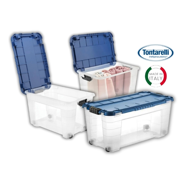 Box Magic 4up 60 Lt 60x30x36 Cm. box universale ideale per la sistemazione di oggetti in ambienti interni ed esterni. Realizzato in polipropilene resistente, questo contenitore di colore trasparente è dotato di ruote per un facile spostamento. perfetto per organizzare e conservare i tuoi oggetti in modo pratico ed efficiente. Sistema Brevettato Per Mantenere il coperchio aperto, proprio come un baule.Chiusura Protettiva efficiente.