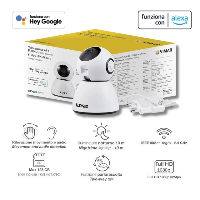 Telecamera Motorizata Da Interno Elvox Tlc Pt Wi Fi Hd 1080p Ob 4mm. Telecamera compatibile con assistenti vocali, risoluzione full-hd 10810p, SD car max 129G “non inclusa” .