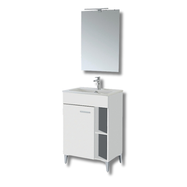 Comp Bagno Greta C Piedi Cm 60 Bianco Lucido Base 1 Anta Vano Giorno Lavabo Ceramico Specchio C Lam.