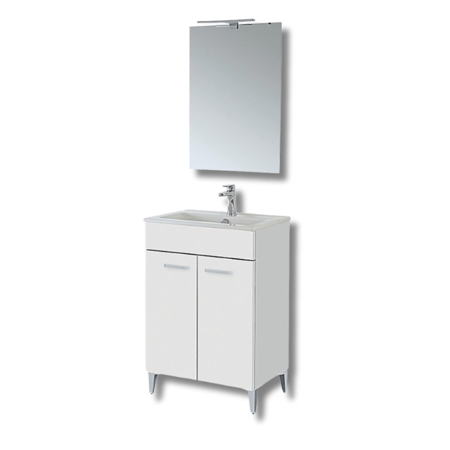 Comp Bagno Greta C Piedi Cm 60 Bianco Lucido Base 2 Ante Lavabo Ceramico Specchio C Lam.