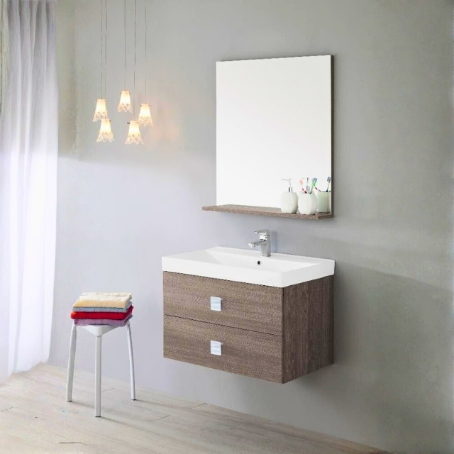 Composizione Bagno Sospesa Bravo 75cm Con Console Ceramica Specchio Con Mensola Rovere Scuro.