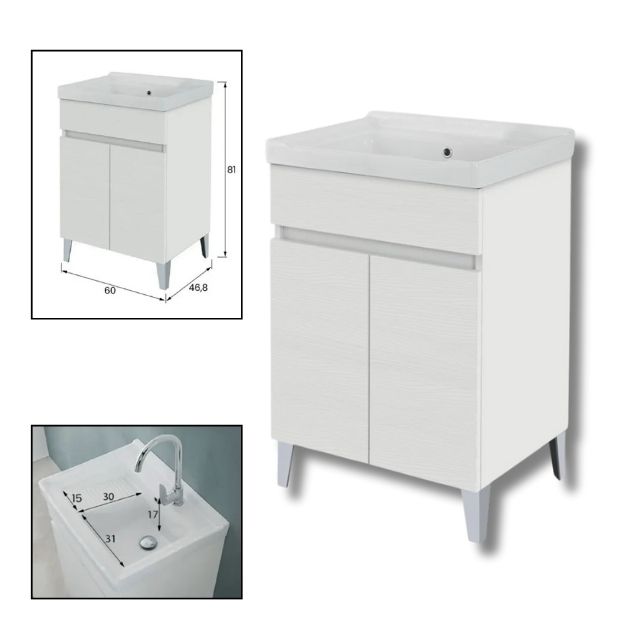 Lavatoio 2 Ante Bianco Frassino C/vasca Ceramica Cm.60×46.8×81. Lavatoio in nobilitato melaminico di 18mm, bianco frassinato, completo di vasca in ceramica.