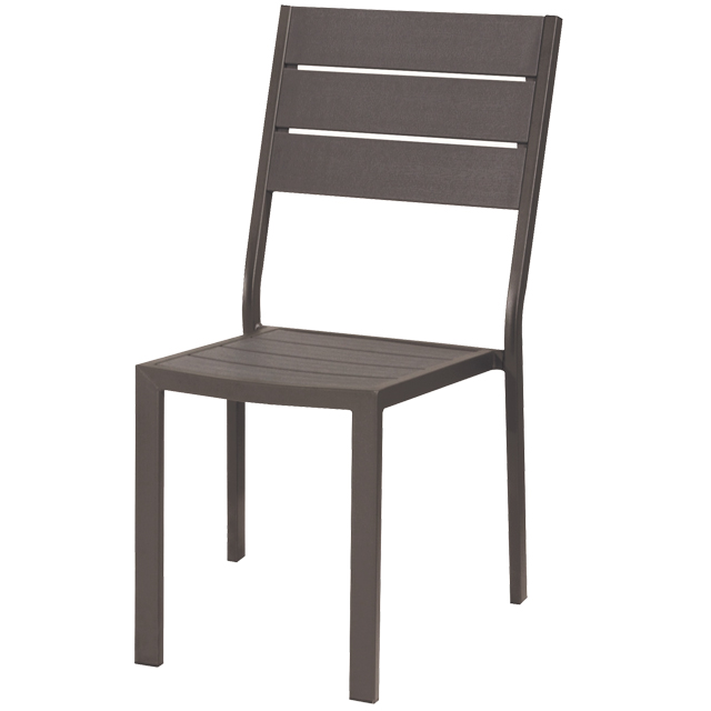 SEDIA TENERIFE in metallo verniciato. Seduta e schienale con doghe in plastica HDPE effetto legno. Dimensioni 57×45 cm – H 88 cm. Impilabile