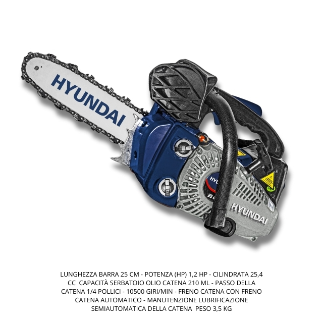 Motosega Hyundai Da Potatura 2t 25 4cc 1 2hp 35420. Motore a 2 tempi, cilindrata 25,4 cc, potenza 1,2 HP, giri minuti 10.500 cc, capacità serbatoio 0,23lt , taglio max 200mm, lunghezza barra di taglio 25cm, serbatoio olio catenza 21 ml.
