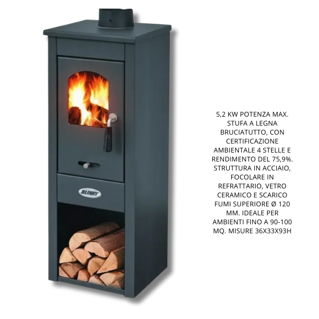 Stufa Acciaio Ekonomik Lux Lm N Porta Vetro Antracite. Stufa di tipo bruciatutto, compatta ed efficiente, ideale per scaldare piccole e medie superfici con il caolore del legno. Struttura top e porta in accaio, focolare in refrattario, vetro ceramico dm 36x33x93 h, classe energetica A