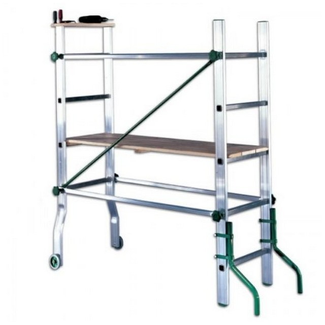 Inoltre il trabattello in alluminio Facal Tano è dotato di pratici stabilizzatori antiribaltamento frontale, di un colore verde brillante, verniciati con vernice epossidica, e di una comoda mensola porta attrezzi in massello di pino. Prodotto completamente MADE IN ITALY con garanzia di 5 anni.